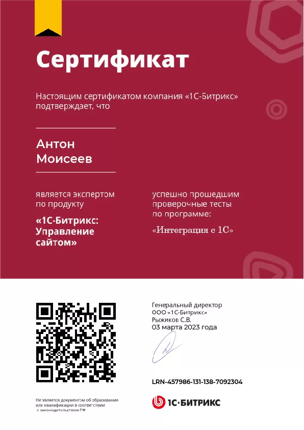 Сертификат Битрикс. Интеграция с 1С