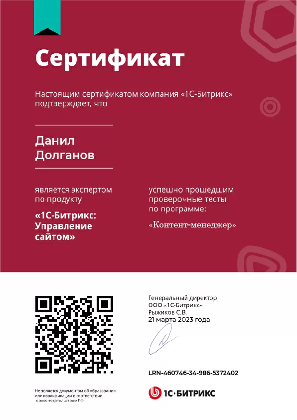 Сертификат Битрикс - Контент-менеджер