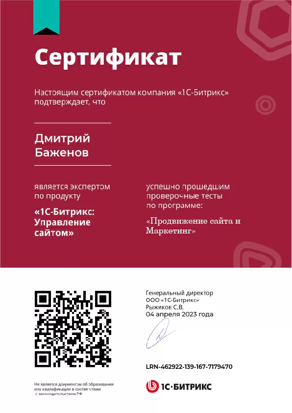 Сертификат Битрикс. Продвижение сайта и Маркетинг