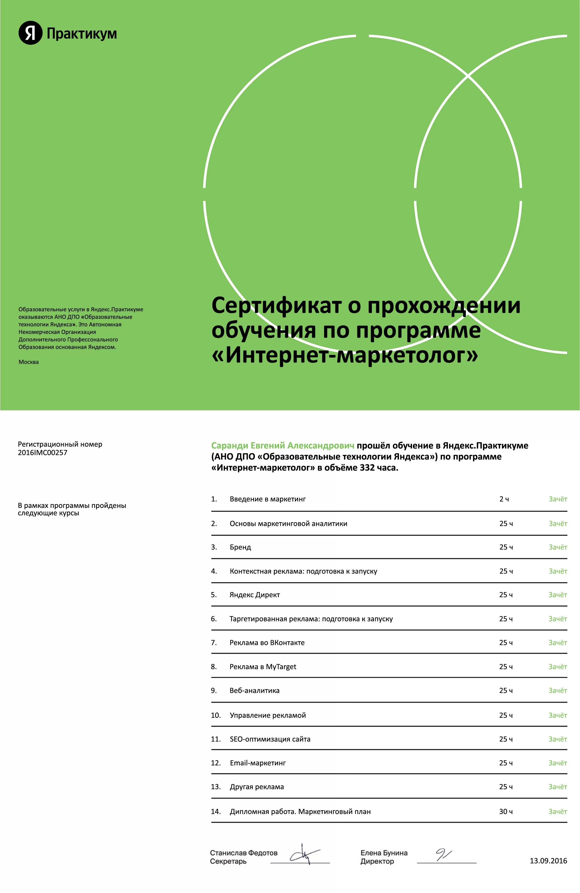 Сертификат Интернет-маркетолог ЯндексПрактикум